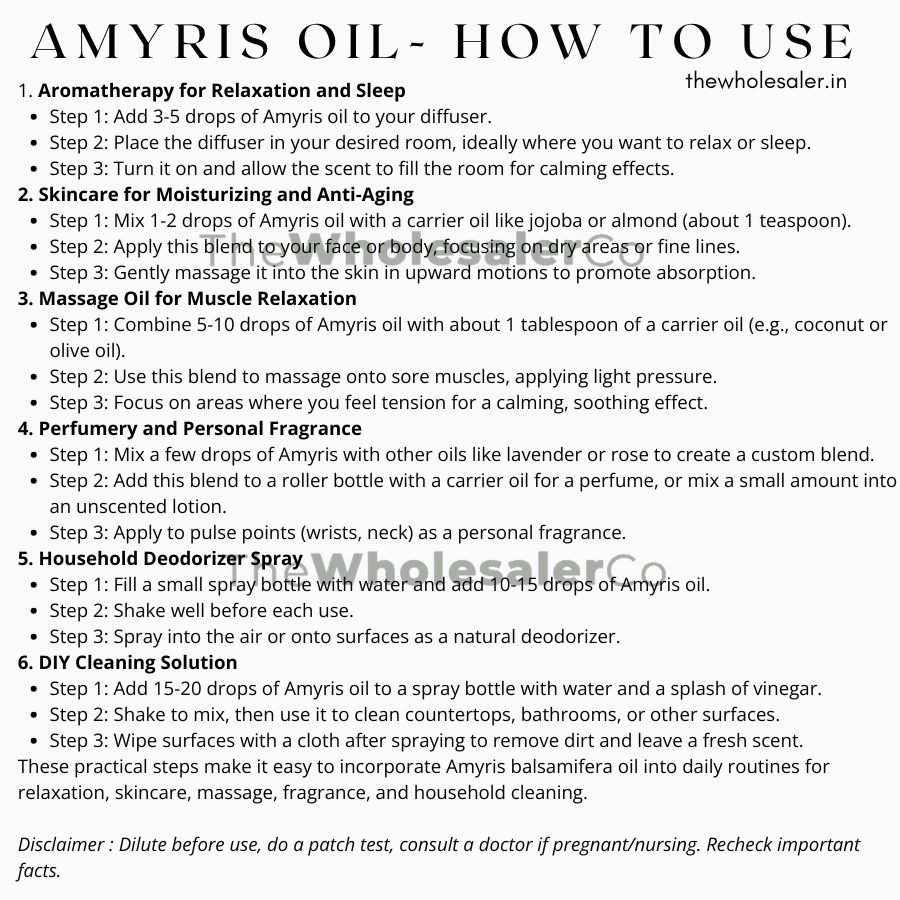 هذه الخطوات العملية تجعل من السهل دمج زيت Amyris balsamifera في الروتين اليومي للاسترخاء والعناية بالبشرة والتدليك والتعطير وتنظيف المنزل.