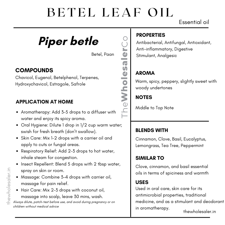 المكون النشط في زيت بايبر بيتل: يوجينول، تشافيبيتول، أليل بيروكاتيكول، كارفاكرول، سافرول، كاريوفيلين، ميثيل يوجينول، وليمونين